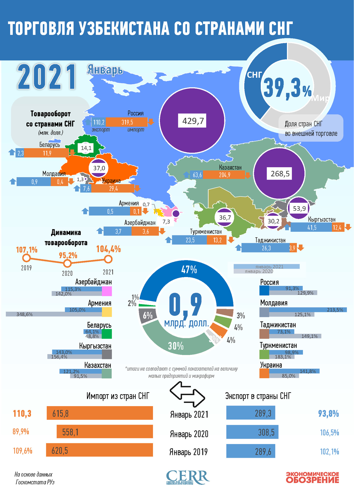 Доля внешнеторгового оборота стран СНГ, по сравнению с аналогичным периодом 2020 года, увеличилась на 10,0%. За этот же период 2019 года увеличение было отмечено на 10,8% и их доля во внешнеторговом обороте, по итогам января 2021 года, составила 39,3%.